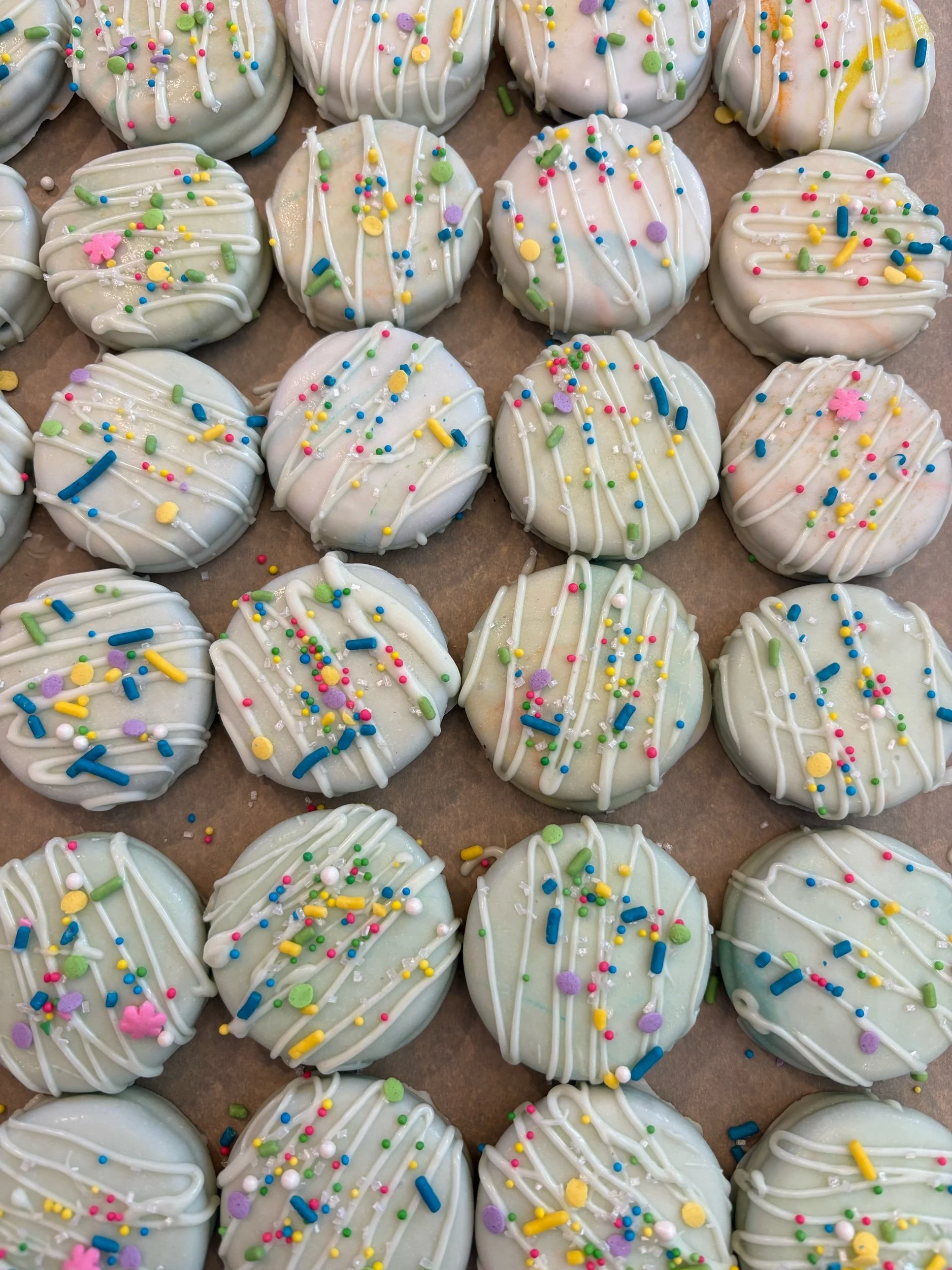 Available in a variety of coatings and finishes: milk chocolate or vanilla almond bark. Some are finished with sprinkles or drizzles for added texture and visual appeal. Individually wrapped for freshness and convenience, these dipped Oreos make great party favors, gift box additions, or indulgent snack-time treats.